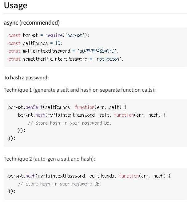 isModified는 몽구스에서 제공해주는 함수이다. if(user.isModified('password')) 는 '만일 이미 user라는 스키마의 password 항목이 변경되지 않은 상태라면 false, 변경된 상태라면 true를 반환해 주세요~' 라는 내용을 수행한다. 추후 회원정보 수정 시 비밀번호를 변경할 때 해당 메소드를 불러와 실행할 것이기 때문에 이 문장을 추가해주었다. 이렇게 하면 비밀번호가 수정될 경우에만 전달받은 새로운 비밀번호를 다시 암호화해준다. hash에는 해쉬화가 완료된 비밀번호가 들어 있다. user.password에 hash를 저장해주면 저장할 데이터들이 완성된다.
