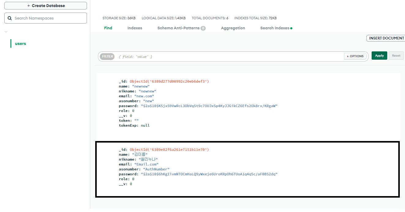 '유저에게 정보 입력받기, 해당 정보 백엔드로 전송하기, 비밀번호 암호화하여 몽구스를 이용해 저장하기' 가 모두 완료된 것이다. 아직 '이메일 인증, 인증번호 발송' 기능은 구현하지 않았다. 따라서 단순한 회원가입이 가능한지만 테스트해본다.