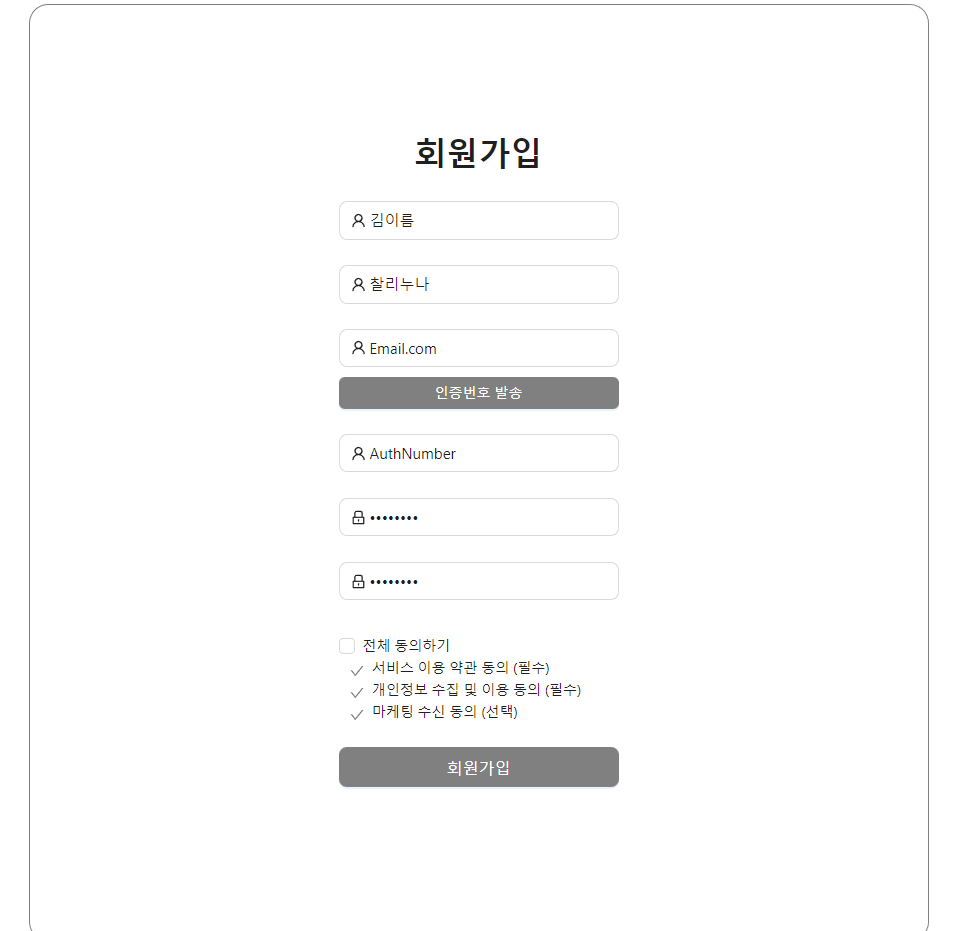 이번 글에서는 회원 가입 기능을 만들 것이다. 피그마로 간단히 디자인 해 놓은 와이어프레임을 따라 프론트엔드를 구성해준다. 디자인은 편리하게 antd(https://ant.design/), Material(https://mui.com/core/) 등 리액트 전용 부트스트랩을 사용해 꾸몄고, 아래와 같은 창을 만들어 줄 것이다. 각 항목을 작성하지 않으면 빨간색 작은 문구로 각 Input 밑에 HelpText를 표기한다. 백엔드의 기능을 완벽히 만들어 놓는 것이 목표이기 때문에 프론트엔드 디자인은 아직 완벽하지 못한 상태...