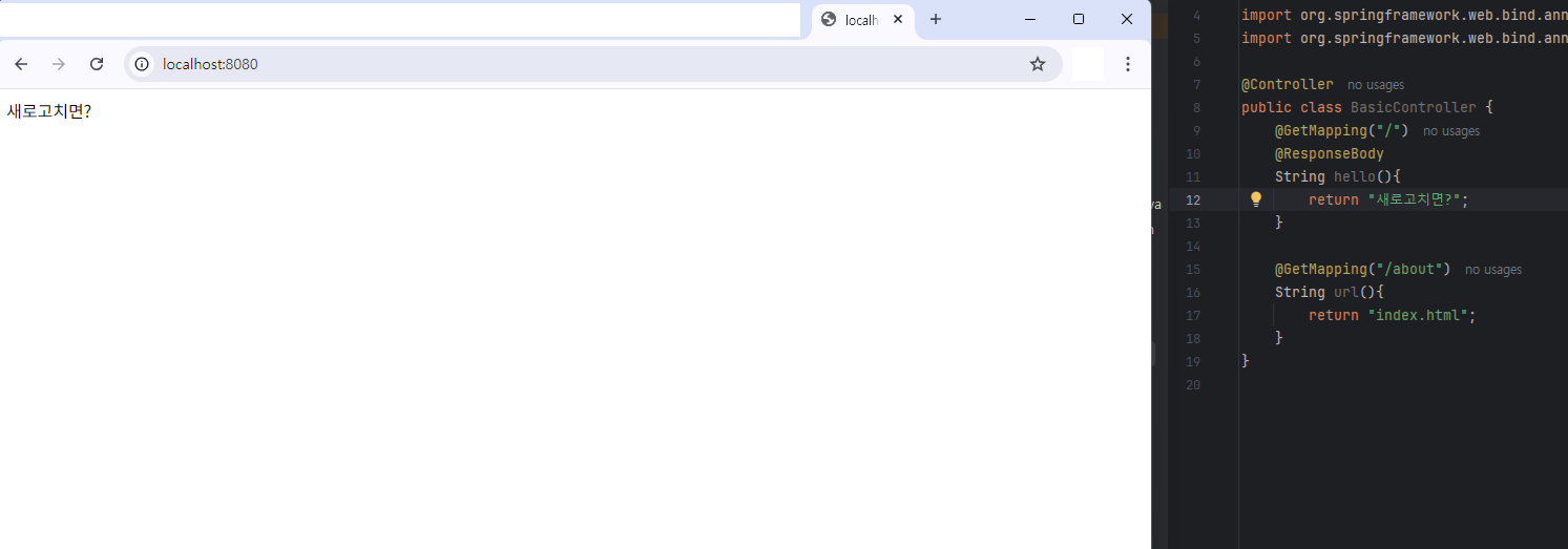 테스트 삼아, GetMapping으로 메인 페이지에 보내는 String 값을 변경하고 저장해 보았다.