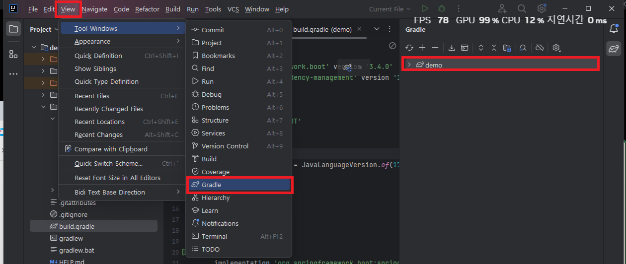 [View] -> [Gradle] 을 클릭하면 오른쪽에 그래들 관리 툴이 나타난다.