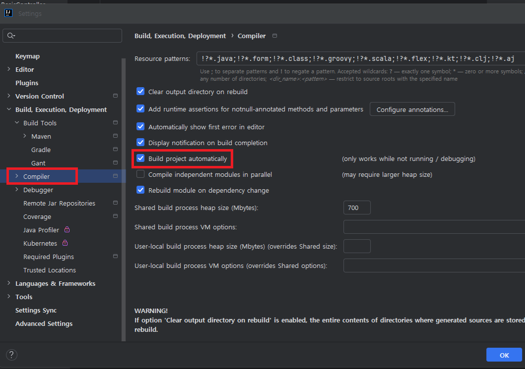 [File] -> [setting] 에서 Build project automatically를 체크한다.