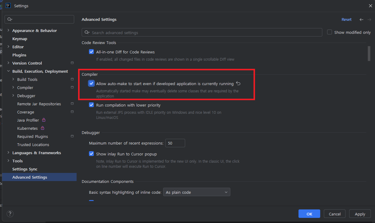 [Advanced Setting] 의 [Compiler]의 Allow auto-make to strat even if developed application is currently running 을 체크한다.