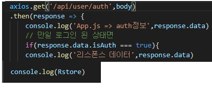 9. App.js 에 api 호출 껍데기를 작성한다. useEffect를 사용해 axios.post로 현재 user의 정보를 가져올 것이다. 만일 유저가 로그인 된 상태라면 응답으로 전달받은 유저의 데이터를 받아오고, 그렇지 않다면 아무 행동도 하지 않는다. redux에 작성한 리듀서들은 useDispatch()를 사용해야 사용할 수 있다. /api/user/auth로 유저 로그인 상태 인증을 보냈을 때 돌아온 isAuth에 담긴 답이 true라면, 콘솔에 받아온 데이터를 출력하고 Redux에 쿠키 및 유저 값을 할당한다.