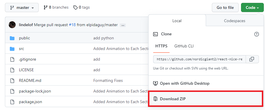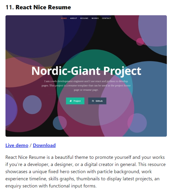 요즘 유행하는 Notion이나, 블로그를 사용해 포트폴리오를 꾸미는 방법도 있겠지만 JS 풀스택 개발자를 지향하는 만큼 사이트로 포트폴리오를 꾸며 보여주면 어떨까 싶어 선택해 보았다. 시험용으로 두번째 사이트에서 아래의 템플릿을 골랐고, Download를 눌러 깃허브에서 Download Zip를 클릭해 압축 파일을 받아 주었다. 당연한 이야기지만 fork를 사용해도 된다.