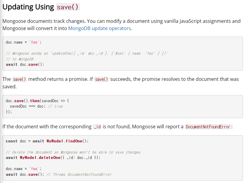 몽구스의 save() 쿼리는 저장을 위해 들어온 데이터의 _id값이 이미 존재하는 경우, 해당 _id 문서에서 수정된 값만 반영하여 데이터를 업데이트해준다. 만일 들어온 데이터의 _id값이 존재하지 않으면 DocumentNotFoundError를 반환한다.