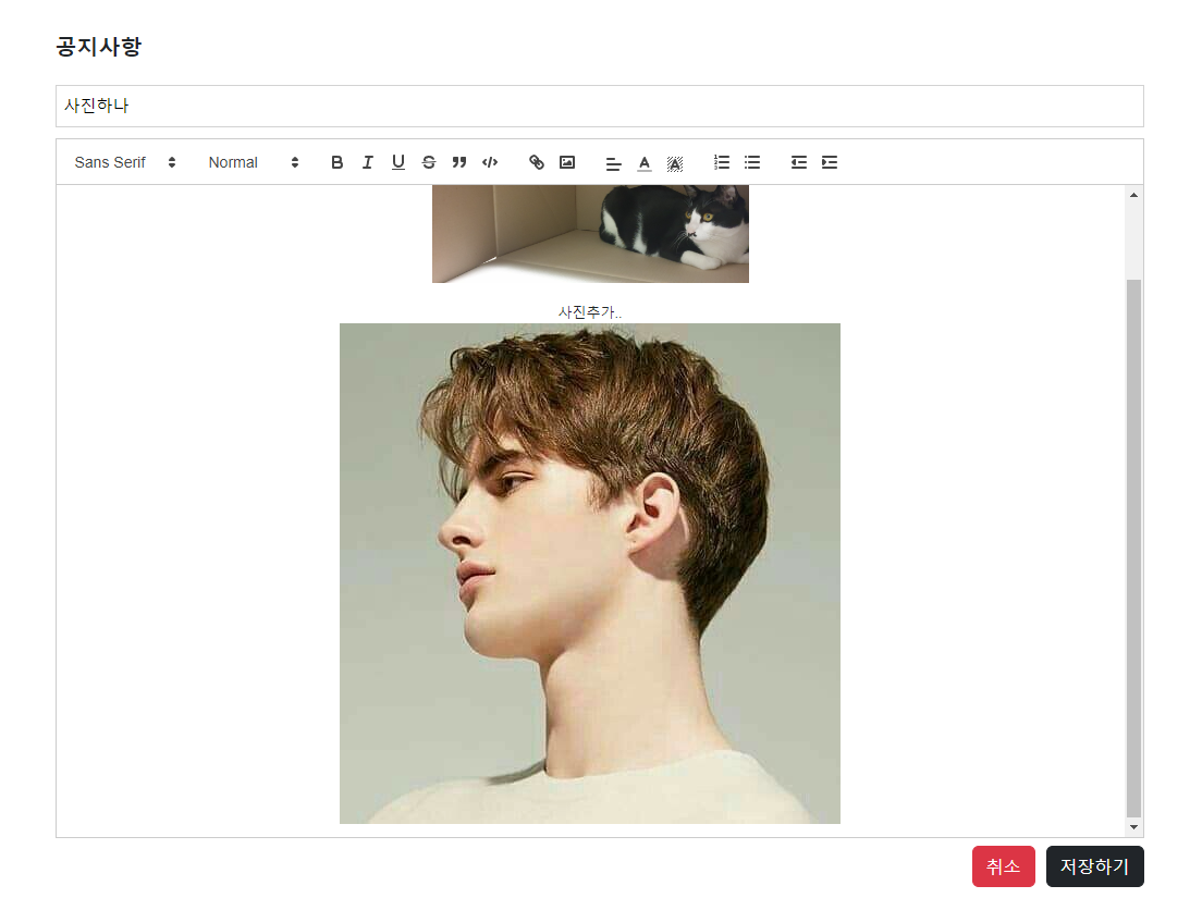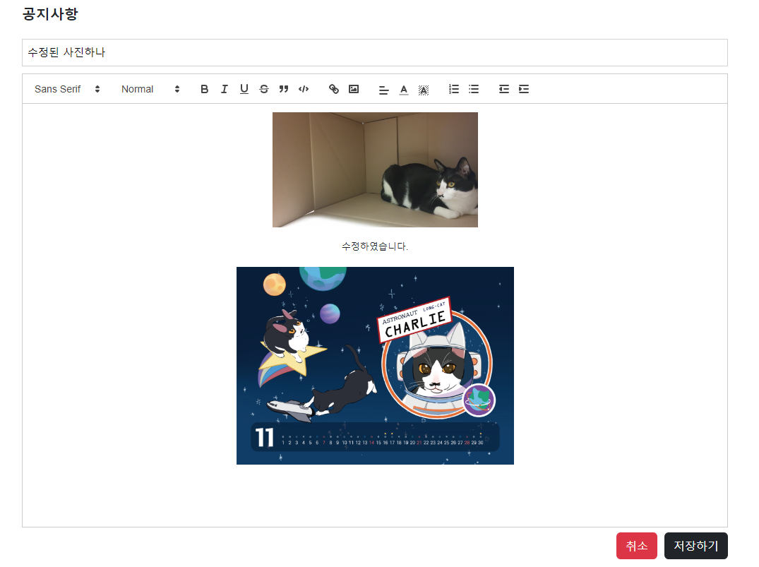 1. 제목 및 게시글 내용의 기본값을, 수정할 게시물의 제목 및 내용으로 설정해주기 2. img src를 추출하되, base64 로 인코딩된 부분만 Blop으로 디코딩 해 주기 3. 백엔드로 수정한 내용들을 전달해, 기존 게시글 수정하기 |