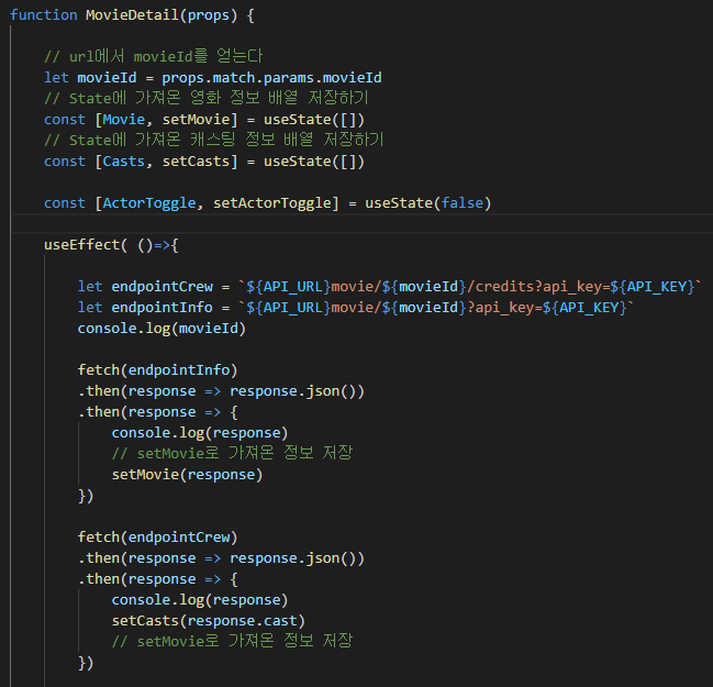 ▶ API에서 제공된 movieId를 url 파라미터로 제공하여 상세페이지 생성(MovieInfo로 컴포넌트 생성하여 불러오기)