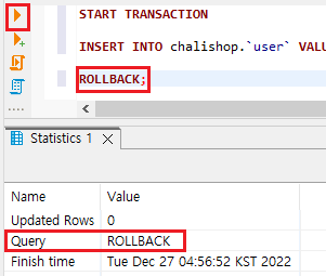 먼저 START TRANSACTION은 트랜잭션을 사용하기 위해 트랜잭션을 실행해 주는 문장이다. START문장이 실행되면 이후의 삽입, 수정, 삭제 쿼리문은 실행은 가능하되 테이블에 반영되지는 않는 '보류' 상태가 된다.
