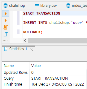 START를 통해 트랜잭션을 실행했으므로, 보류시킬 INSERT문을 작성해주었다. 정상적으로 실행되었으나 아직 '보류'상태에 있으므로 테이블에는 결과가 반영되지 않았다.