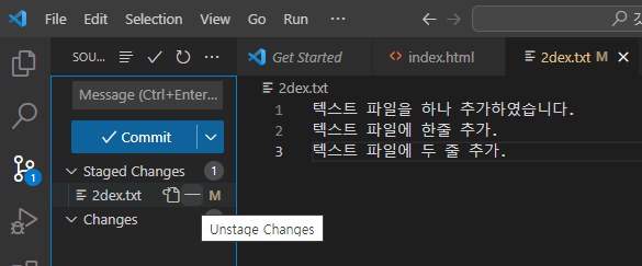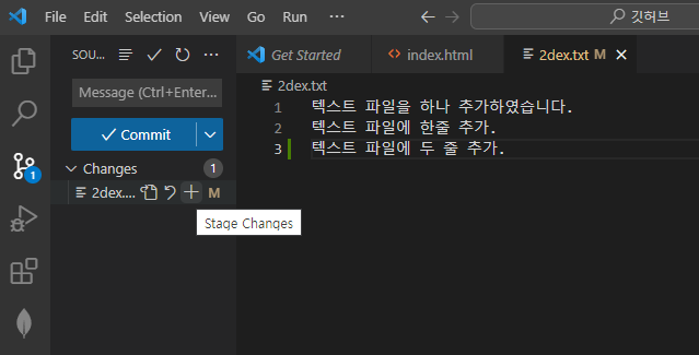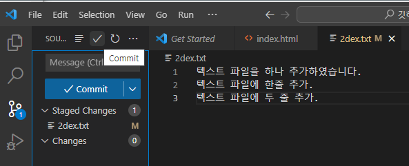 커밋은 터미널 명령어로 할 수 있지만, VsCode를 사용하면 깃 전용 메뉴를 이용해 GUI로 처리할 수도 있다. +버튼을 누르면 add를 실행해주고, - 버튼을 누르면 resotre를 실행해준다. 체크 버튼을 누르면 스테이징한 파일들이 커밋된다.