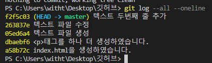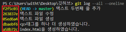 commit 메세지를 '텍스트 두번째 줄 추가' 로 주고, 체크버튼을 눌러 commit 해 주었다. git log -all --online을 이용해 전체 깃로그를 확인해보니 커밋이 정상적으로 되었음을 알 수 있다.
