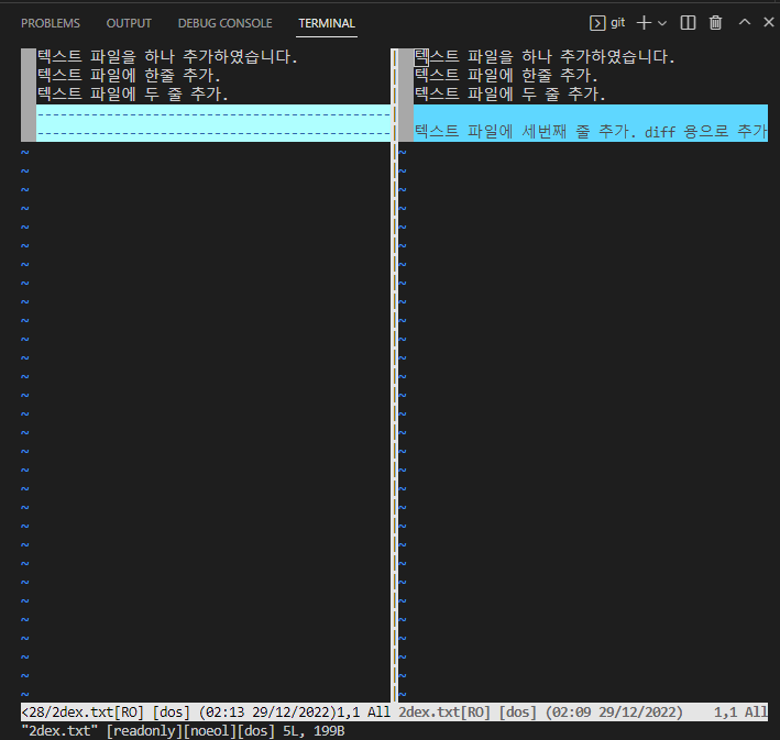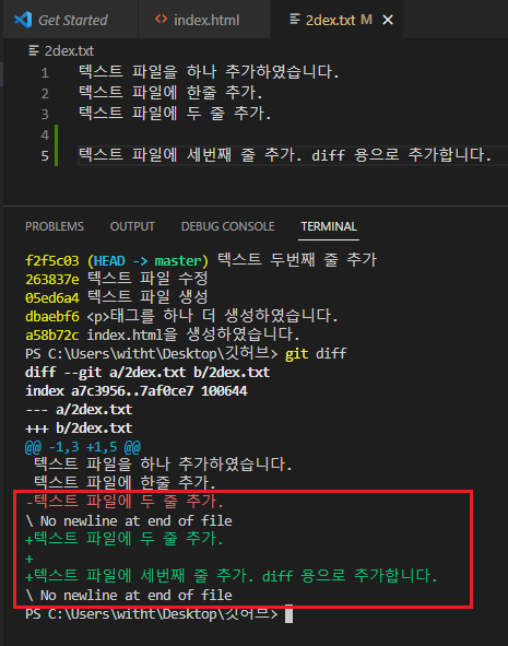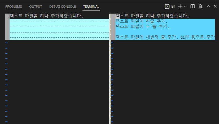 그런데 조금 이상한 내용이 있다. 실제로 수정된 부분은 마지막 줄인 '텍스트 파일에 세번째 줄 추가... ' 부분밖에 없는데, 바로 윗줄인 '텍스트 파일에 두 줄 추가.' 부분까지 변경되었다고 알려주는 것이다. 저 부분에서 엔터키를 입력했기 때문인데, 터미널의 한계와 이러한 엔터키 등의 변동사항까지 자잘하게 알려주는 부분 때문에 git diff를 일반적으로 사용하는 경우는 잘 없다고 한다.