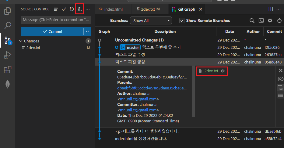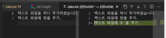 VsCode의 Git메뉴에서 그래프모양 버튼을 클릭하면 현재까지의 커밋 결과가 기록되어 있다.우측의 파일 이름을 클릭하면, Vim 에디터에서 보여주던 것 처럼 변경 내용을 살펴볼 수 있다.