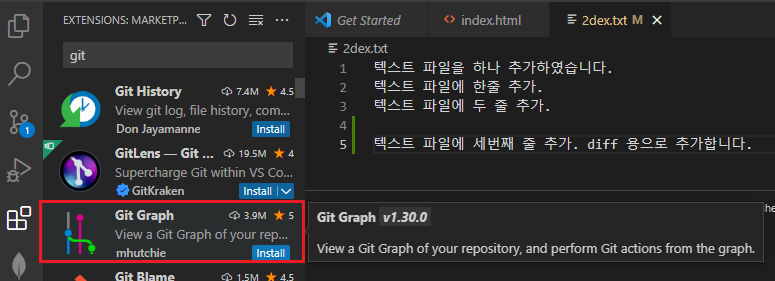 굳이 Vim 에디터를 사용해 볼 필요 없이, VsCode의 경우 확장 기능(익스텐션)을 사용할 수도 있다. Git Graph를 검색하고 install을 눌러 다운로드 해 주었다.