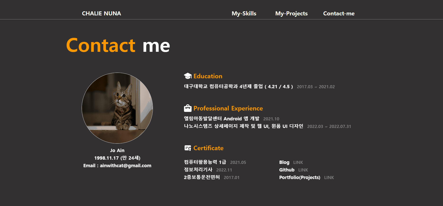 ▶ 학력, 경력, 자격증 등 간단한 이력과 Unsplash Open api를 사용한 랜덤 프로필 이미지, 이름, 이메일을 기재한 Contact-me 페이지. 프로필 사진은 api를 통해, 다른 페이지에 들어갔다가 재접속할 경우 새로운 랜덤한 이미지로 바뀐다. 키워드를 'cat'으로 주었기 때문에 바뀌는 이미지는 모두 고양이 랜덤 이미지이다. 모바일 반응형으로, 모바일 뷰로 바꿀 경우 세로 배열로 바뀌도록 배치하였다.