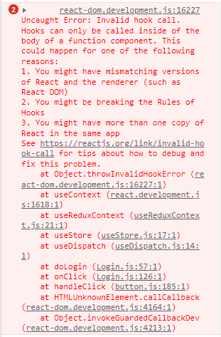 로그인에 성공한 후, 로그인 한 아이디 정보를 Redux에 저장하려고 리덕스 훅을 사용하였더니 다음과 같은 오류가 일어났다.