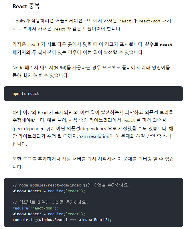 3. You might have more than one copy of React in the same app 의 경우 패키지 폴더 내에 react 패키지가 중복되어 있을 가능성이 있다는 뜻으로, 아래의 방법에 따라 콘솔 출력으로 확인해 볼 수 있다.