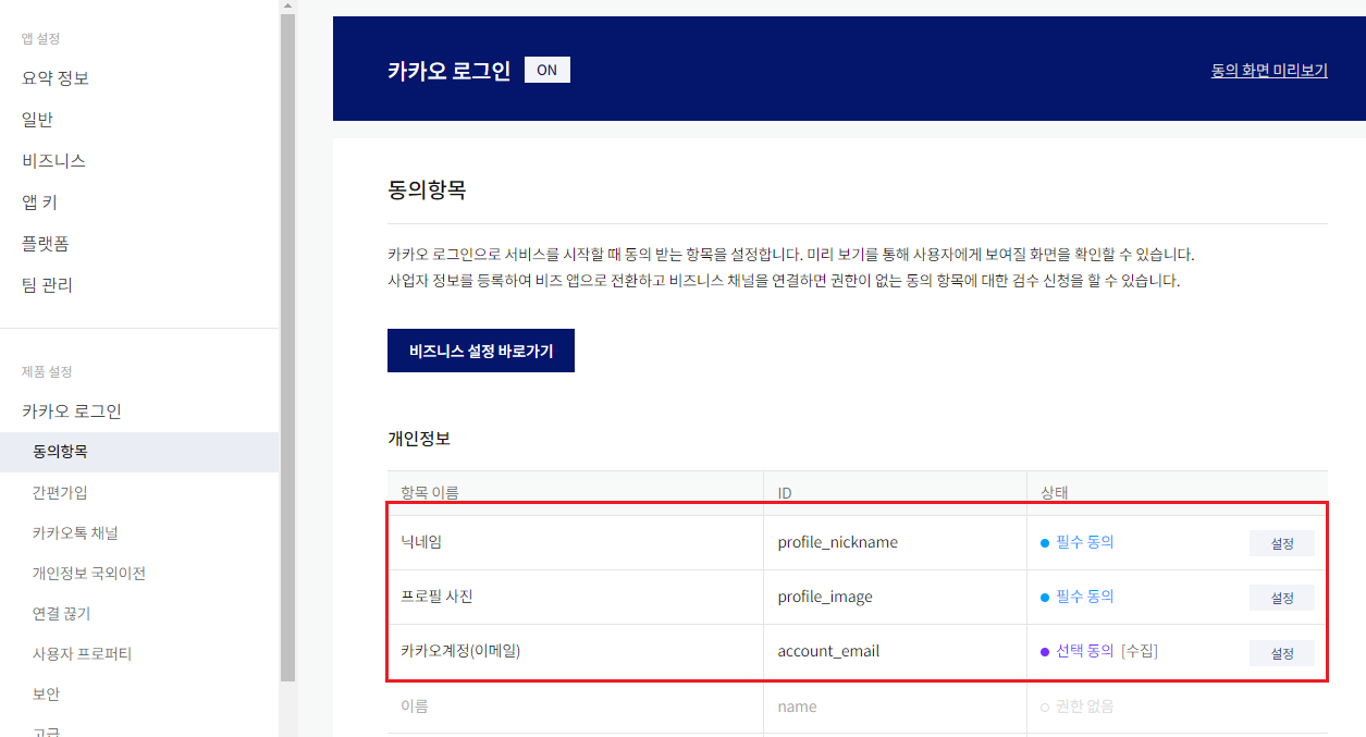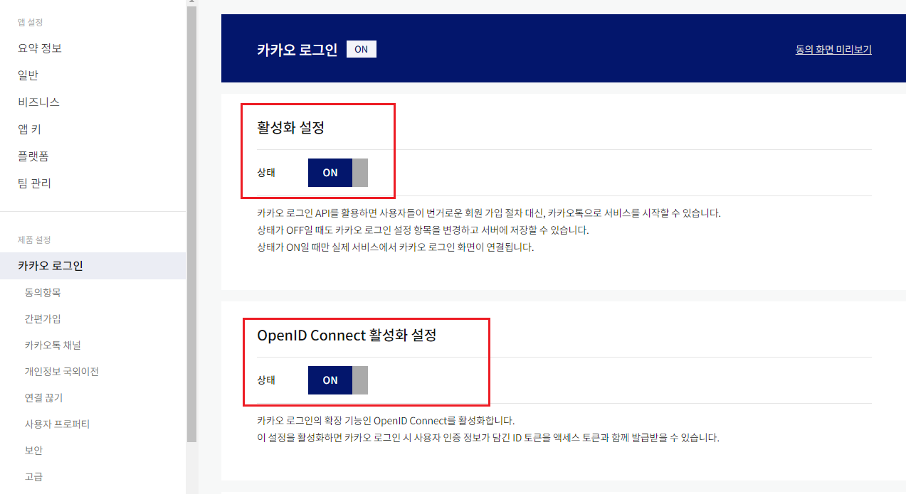 또한 카카오 로그인에서 활성화 설정과 OpenID Connect 활성화 설정을 모두 ON으로 바꾸어 주었다.