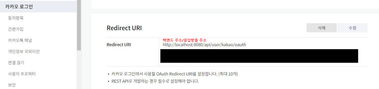 Redirect URI는 '우리가 로그인 진행 해 줄게, 응답 값은 어디로 받을래?' 에 대한 답을 적는 곳이다. 나는 /kakao/oauth 라는 라우터로 받을 것이므로 해당 주소를 입력해 주었다.