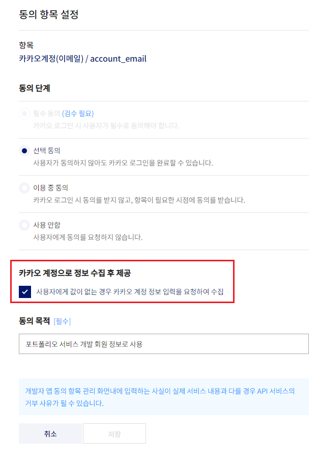 동의 항목에서는 내가 사용자에게 어떤 정보를 전달받을지를 선택할 수 있는데, 이메일을 입력 받기 위해 [설정] 버튼을 클릭한 후 오른쪽과 같이 '카카오 계정으로 정보 수집 후 제공' 을 체크했다.