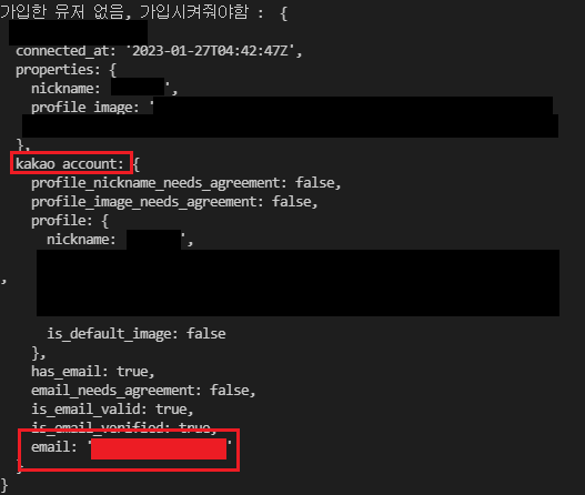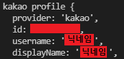 내가 사용했을때는 profile.username과 displayName에 닉네임이 들어있었고, _json으로 시작하는 키:값 쌍의 오브젝트의 kakao_account.email 에 이메일 정보가 들어있었다. 카카오가 업데이트 할때마다 달라지는 것 같아서 개발할 때마다 출력해보고 사용하는게 좋을 것 같았다.