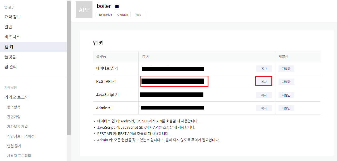 진행하기에 앞서, 카카오 디벨로퍼 사이트에서 카카오 로그인 api를 사용하기 위한 사전 설정을 해야 한다. 내 애플리케이션을 등록해주고, 앱 키의 REST API 키를 복사해준다.